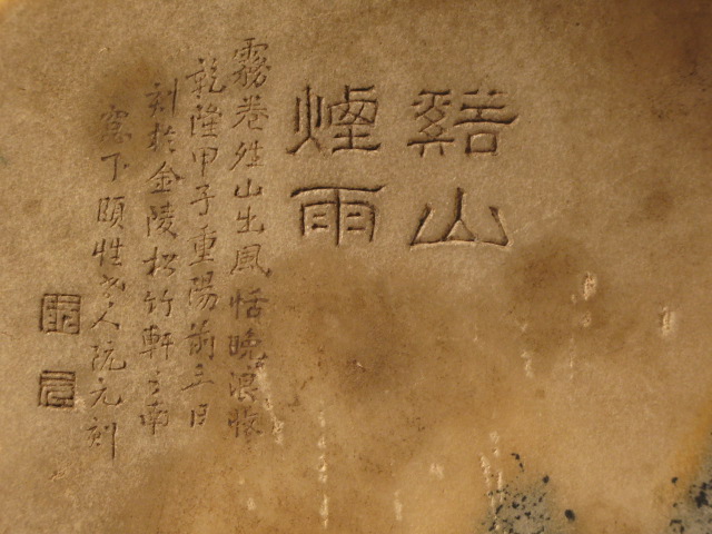 阮元的硯銘是這樣寫的:「此恩平茶坑綠石,質潤而堅,有黃龍氣,與端溪北石之綠端,枯而無氣不同」。